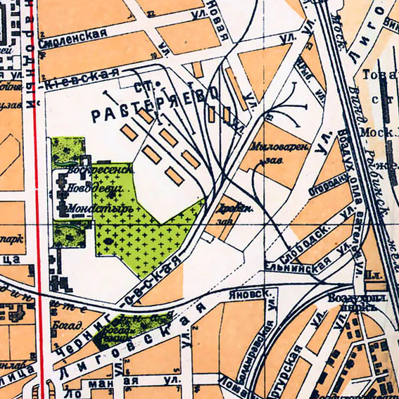 Вплоть до начала 1900-х годов трасса Киевской улицы за пересечением с Лубенской улицей, напротив участка № 10 делала излом примерно на 45° вправо, примыкая к Черниговской улице под прямым углом[3] напротив Мыловаренного завода Жукова. В дальнейшем Киевскую улицу спрямили, продлив её трассу на восток, в сторону линии Виндаво-Рыбинской железной дороги[4]. В результате новый перекрёсток Киевской и Черниговской улиц оказался остроугольным (45°). Отрезанный участок Киевской улицы был вскоре поглощён территорией, на которой промышленник и купец С. И. Растеряев[5] развернул путевое хозяйство своей частной товарной станции, названной Растеряево, выстроив многочисленные склады, позже вошедшие в историю под названием Бадаевских складов.