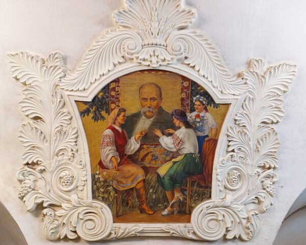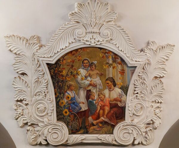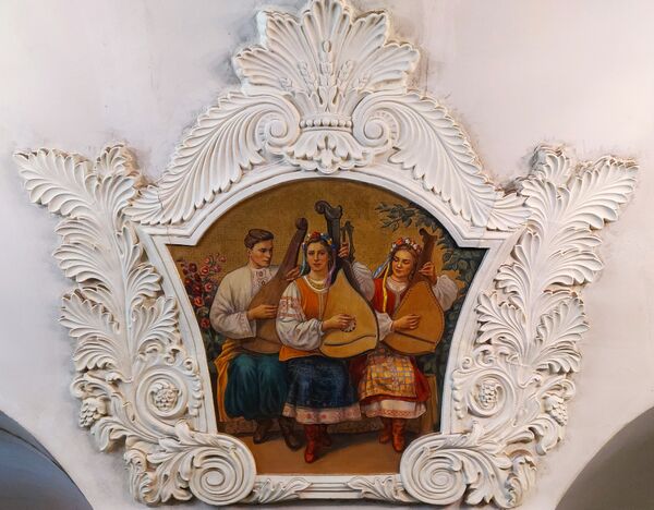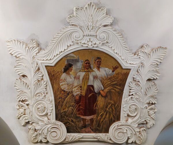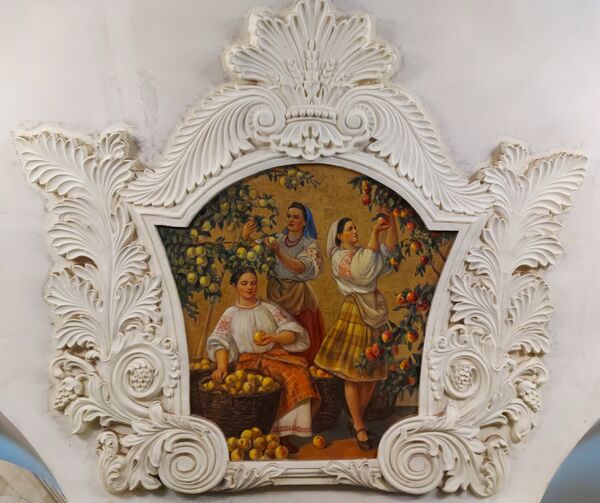 На своде над пилонами в лепных медальонах размещены 24 фрески, изображающие трудящихся Советской Украины. Со стороны платформ также размещены фрески, преимущественно с изображениями фантастических растений. В западном торце станции находится крупное панно, изображающее народные гуляния на праздновании 300-летия воссоединения Украины с Россией. Авторы живописных произведений — большой творческий коллектив художников: В. А. Коновалов, В. Н. Аракелов, П. М. Михайлов, Л. А. Карнаухов, Т. В. Коновалова, А. К. Ширяева, К. П. Аксёнов, И. В. Радоман, Г. И. Опрышко.