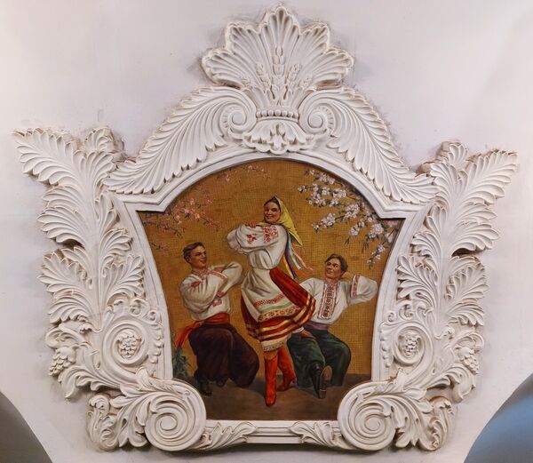 Оформление посвящено Советской Украине и теме воссоединения Украины с Россией. Станция украшена большим количеством живописных полотен. Архитектурная целостность станции достигается применением светло-серого мрамора «коелга» для отделки пилонов как центрального зала, так и боковых нефов, а также путевых стен. Пилоны дополнительно украшены цветным керамическим карнизом; керамический фриз, антаблементом венчающий пилоны, декорирован украинскими орнаментальными мотивами с элементами классики. Пол, выстланный серым янцевским гранитом, подчёркивает ощущение сдержанной целостности, по периметру пилонов вместо гранита используется и мрамор «салиети», благодаря чему усиливается ритм пилонов. Освещение — люстры авторского исполнения из гранённого хрусталя с лампами накаливания, впоследствии неоднократно применявшиеся на других станциях (например, на старой станции «Первомайская» (в депо «Измайлово») и на «ВДНХ»).
