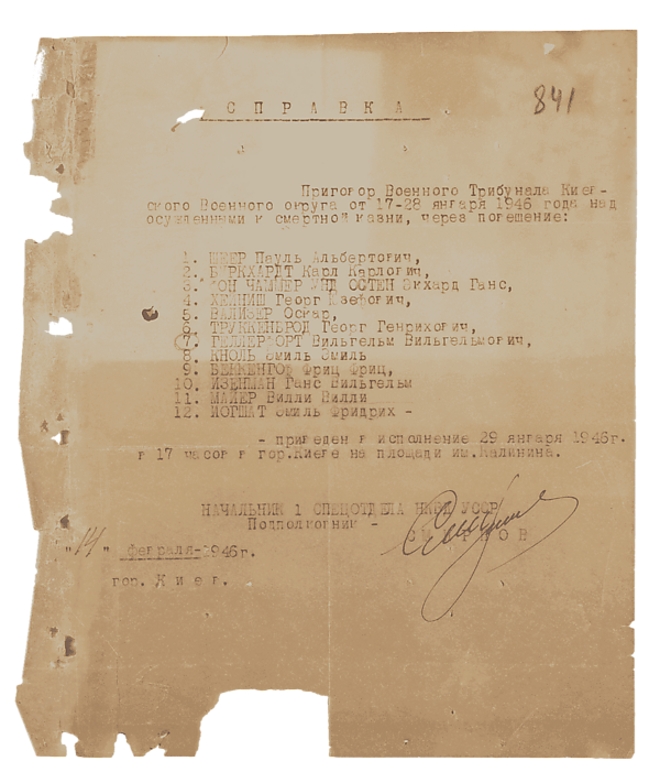 - Докладная записка наркома юстиции СССР Н. М. Рычкова, наркома внутренних дел СССР С. Н. Круглова и главного военного прокурора Н. П. Афанасьева И. В. Сталину о завершении судебного следствия по делу о злодеяниях немецко-фашистских захватчиков на территории Украинской ССР. 25 января 1946 г. // РГАНИ. Ф.3. Оп.50. Д.552. Л. 106—109.