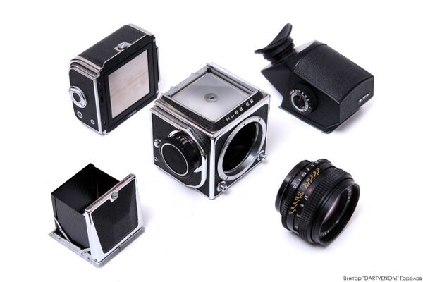 - Фотоаппарат с объективом, пентапризмой с экспонометром, кассетой и катушкой.