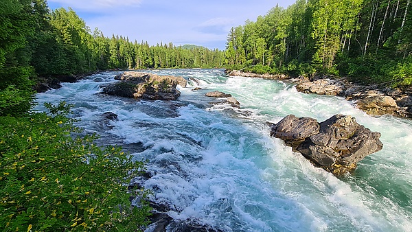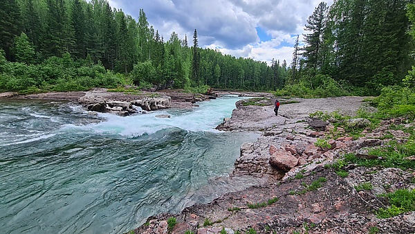 К полудню мы дошли до Кизыра. Река уже вскрылась. Неожиданно я увидел вместо бурого потока совсем невинную реку с ровным, хотя и быстрым течением. Вода была настолько чиста и прозрачна, что можно было различить песчинки на дне реки. И если бы не небо, отражавшееся в ней светло-бирюзовым отливом, можно было бы сказать, что апрельская вода в Кизыре бесцветна. Как приятно смотреть на этот прозрачный, быстро несущийся поток в заснеженных берегах! Склонившиеся над рекой тёмные ели придавали панораме ещё более красочный вид.