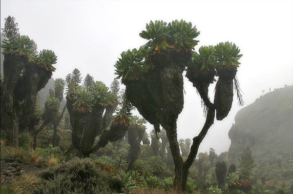 - Вересковые луга, 2800—4000 м. По мере подъёма количество осадков уменьшается, поэтому примерно с 2400 м лес становится не таким густым. Верхняя граница леса проходит на высоте 2800-3000 м, дальше идёт зона своеобразных афро-альпийских вересковых болот и лугов. Это земля гигантов — гигантского вереска, древовидного крестовника (Dendrosenecio Kilimanjari) и гигантских лобелий[28].