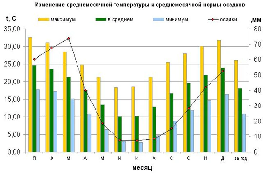 | Максимум(°C) | 32,6 | 31,1 | 28,5 | 24,8 | 21,3 | 18,2 | 18,6 | 21,3 | 25,5 | 27,9 | 30,1 | 31,8 | 26,0 | |