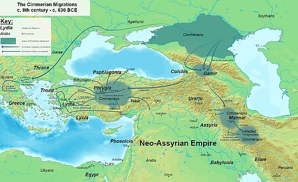 В какой-то период (иногда предполагается последняя четверть VIII века до н. э.[21]) киммерийцы начали совершать военные походы в западное Закавказье и на север Малой Азии; некоторая их часть фактически переселялась туда из Северного или Восточного Причерноморья[К. 9]. Традиционно предполагается, что миграционный процесс шёл под давлением скифов, вытеснявших киммерийцев из причерноморских степей[21]. Проникнув в переднеазиатский регион, киммерийцы оказались вовлечены в противоборство значительных государств Древнего мира — Ассирии, Ионийского союза, Лидии, Урарту и других. Известно, что уже в конце VIII века до н. э. часть киммерийцев осела на севере Малой Азии; вероятная локализация — восточная Каппадокия (страна Гамирр ассирийских источников)[41].