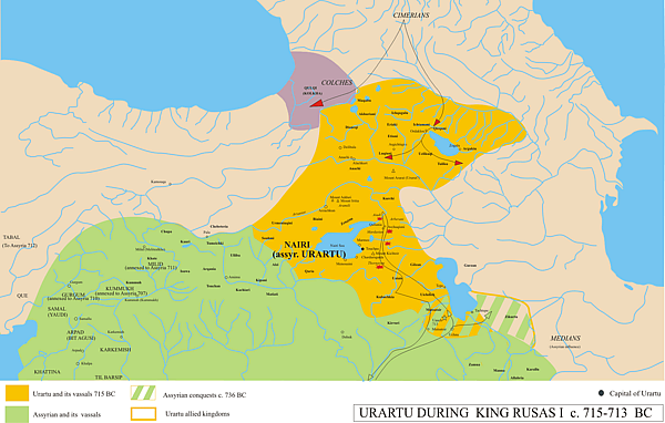 В конце VIII века до н. э. (иногда предполагается 715—714 года н. э.[11]) на киммерийцев напал царь Урарту Руса I (либо это был Аргишти II). По данным ассирийских шпионов, страна, в которой в это время находились киммерийцы, была расположена рядом с землёй Гурианиа[64]. Урартская армия в походе на страну Гамирр была разбита, погибло много знатных сановников (в том числе подчинённый Урарту правитель страны Уаси), а сам урартский царь вынужден бежать. Поражение вызвало восстания в Урарту и отпадение от государства периферийных владений[65]. Часто современные исследователи сообщают, что разгром от киммерийцев послужил причиной вторжения в Урарту ассирийского царя Саргона II[21]. Однако, имеются сведения, что урартский царь подавил все мятежи внутри страны, укрепил крепости по границам и был готов к войне с Ассирией. Вероятно, в Урарту не боялись вторжения разгромивших их киммерийцев, так как в конце VIII века до н. э. киммерийцы ещё не набрали достаточной силы в Малой Азии, реальную угрозу они стали представлять позднее — в 1-й половине VII века до н. э. Вторжение ассирийцев в Урарту произошло на 8-м году правления Саргона II (в 714 году до н. э., либо несколько позднее), часть территории Урарту была разграблена, нанесён значительный военный и хозяйственный урон[66].