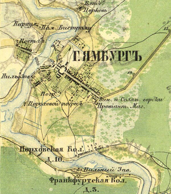 ЯМБУРГ — город уездный на правом берегу реки Луга, от Санкт-Петербурга — 121 верста, от Москвы — 725 вёрст, число домов — 219, число жителей: 785 м. п., 518 ж. п.;