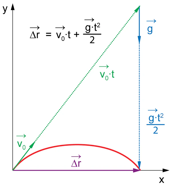 Для тел, движущихся с малыми скоростями, сопротивлением воздуха можно пренебречь. Пусть точка в нулевой момент времени была брошена со скоростью под углом к горизонту. Для оси , направленной вертикально вверх, и оси , направленной по горизонту, уравнения движения в проекциях на оси: