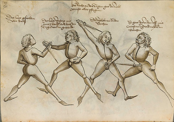 Тактика боя напоминала современные системы ножевого боя, с акцентом на колющие движения обратным хватом. При поединке против закованного противника особое внимание уделялось пробивающим ударам в уязвимые места между доспехами[35]. С исчезновением брони техника изменилась в сторону классического хвата[35].