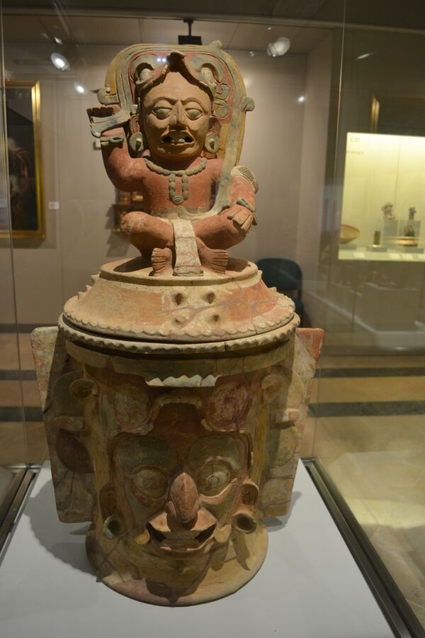 Божество солнца может изображаться в виде царя (ахау), восседающего на троне (как на знаменитой повествовательной «Вазе с кроликом» из Наранхо), или правителя, держащего в руках двуглавый «церемониальный жезл»[4].