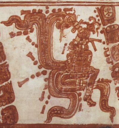 - Цари‑предки майя, отождествляемые с божеством солнца, иногда изображались вертикально спускающимися из зенита (на стеле № 2 из Такалик‑Абаха и стеле № 31 из Тикаля).