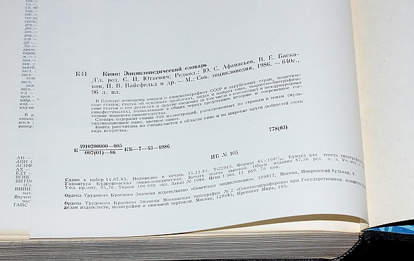 - Кино : Энциклопедический словарь / гл. ред. С. И. Юткевич ; редкол.: Ю. С. Афанасьев, В. Е. Баскаков, И. В. Вайсфельд и др. — М. : Советская энциклопедия, 1987. — 637, [3] с. : [96] л. ил. — 100 000 экз.