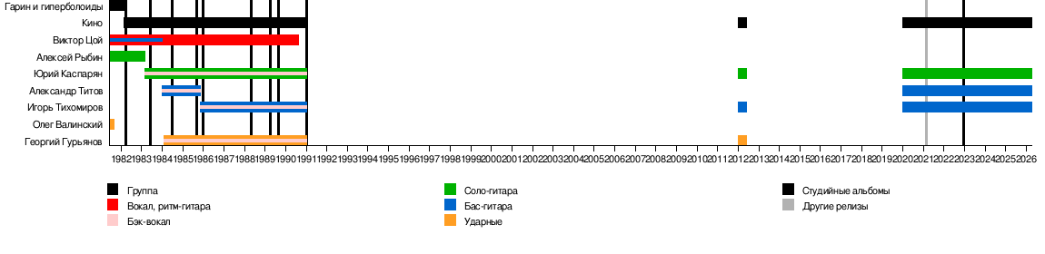 - Виктор Цой — вокал, ритм-гитара, акустическая и 12-струнная гитара (1981—1990); бас-гитара (1981—1983); (умер в 1990);