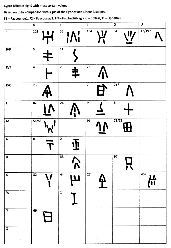Исследователей обнадёживал тот факт, что письмо-потомок — кипрский силлабарий — было дешифровано, а несколько десятков знаков предполагаемого письма-предка — критского Линейного письма А — также можно было «прочитать», исходя из их сходства со знаками более позднего дешифрованного Линейного письма Б. Тем не менее, начертание кипро-минойских знаков сильно отличается и от кипрского силлабария, и от Линейного письма А, поэтому с надёжностью можно установить значение не более 15-20 знаков. Для части знаков надёжность подкрепляется статистическим анализом употребления; в частности, предполагаемые знаки для гласных a и i встречаются исключительно в начале слов, что характерно и для других письменностей эгейской группы.