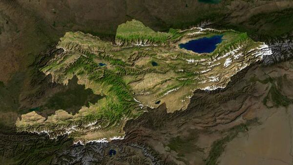 Киргизия не имеет выхода к морю. Государство расположено в Северном и Восточном полушариях, между 39°11′—43°16′ северной широты и 69°15′—80°18′ восточной долготы[46]. Расстояние от восточной до западной части государства составляет около 900 км, а от северной до самой южной — около 410 км[47]. Страна граничит с Китаем на востоке и юго-востоке, Казахстаном — на севере, Узбекистаном — на западе, и Таджикистаном — на юге[48].