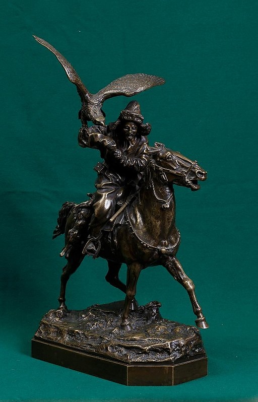 Скульптура представляет собой фигуру всадника на лошади. На правом предплечье мужчины сидит беркут, левая рука согнута и прижата к груди — в ней находятся поводья. На голове у всадника находится малахай. Одет он в шаровары и сапоги с острыми загнутыми носками. Виднеется пояс, на котором справа располагается небольшая сумка. У седла видно ружьё, а сзади — туша убитой лисицы. Лицо киргиза проработано: оно имеет продолговатую форму, выраженную мимику и морщины, широкие скулы, длинную бороду и усы. На постаменте справа находится подпись «лъпил Е. Лансере», а сзади слева – надпись «Н. Штанге».