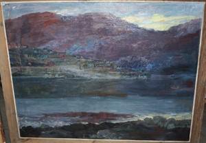 На картине представлен реалистический пейзаж с горизонтальной композицией. На переднем плане изображена водная поверхность, а на противоположном высоком берегу у подножия гор расположены небольшие домики. Работа выполнена в сиренево-коричневой цветовой гамме. Сцена отражает события Киркенесской операции октября 1944 года и связана с территорией Норвегии.
