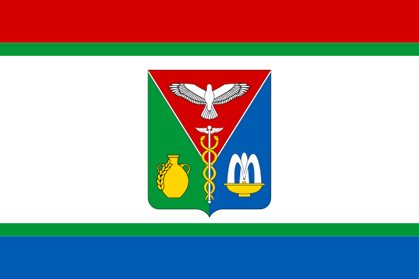 Прямоугольное полотнище с отношением ширины к длине 2:3, воспроизводящее изображение фигур из герба поселения: в вилообразно разделенном красном, зелёном и синем поле белый с жёлтой вершиной окрыленный белым Меркуриев жезл, обвитый желтыми змеями, сопровождаемый вверху белым орлом прямо, справа — жёлтым кувшином, по правой стороне которого сообразно с ей положена жёлтая головка хлебного колоса, слева — жёлтой плоской чашей с сердечником, из которого бьет стекающий в ту же чашу белый фонтан о трех струях.[39]