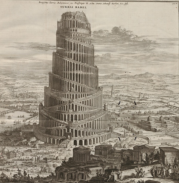 Последний большой трактат Кирхера — «Вавилонская башня» — увидел свет в 1679 году; богато иллюстрированное сочинение описывалось во «Всеобщей биографии» Луи-Габриэля Мишо и как наиболее учёное, и одновременно как самое фантастическое из его творений[146]. Трактат был разделён на три части. В первой речь шла о мире через 130 лет после Потопа; во второй части описывалось собственно строительство Вавилонской башни на основании всех прочих данных о чудесах строительства в древнем мире, включая сады Семирамиды, египетские обелиски, Лабиринт Минотавра и Колосс Родосский. В этой части помещены описания древних руин в Междуречье, включая Ктесифон, а также генеалогия Ноя, Иафета, Хама и Сима[151]. Здесь тоже хватало причудливых сюжетов. Например, Кирхер задался вопросом, мог ли Нимрод спустя 275 лет после Потопа набрать достаточное число строителей. Выкладки выглядели следующим образом: если у каждого из сыновей и дочерей Ноя каждый год рождалась двойня, то ко времени начала строительства предельное число жителей Земли могло достигнуть 23 328 000 000 человек. Кирхер очень гордился своими выкладками, однако ко времени опубликования «Вавилонской башни» подобные расчёты представили Абрахам Бухгольцер и Уолтер Рэли. Последний использовал расчёты для того, чтобы доказать, что Египет и другие страны уже были населены до потопа и могли полностью восстановить прежнюю численность населения за 70 лет[152].
