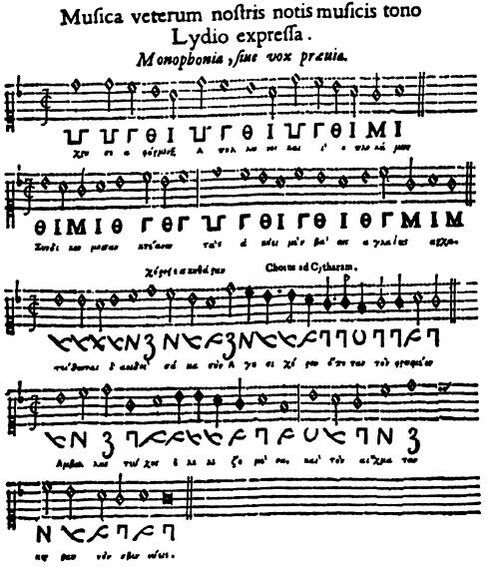 Весьма примечательна теория музыкальных аффектов Кирхера, сопряжённая с функциональной классификацией вокальной и инструментальной музыки по 9 разделам[195]. В разделе о греческой музыке содержатся как важные для истории музыки исследования, так и мистификация. В первом случае — это передача нотации Алипия в современной системе; во втором случае речь шла об оде Пиндара, якобы обнаруженной во время путешествия в 1637—1638 на Сицилии, причём манускрипт, по уверениям Кирхера, был утрачен[196].