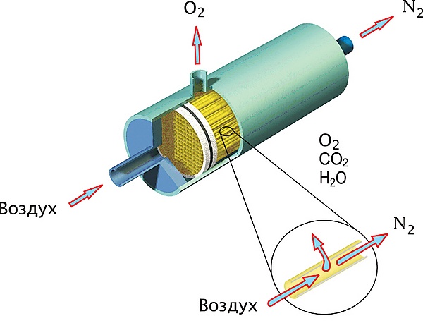 В основе разделения газовых сред с помощью мембранных кислородных установок лежит разница в скоростях проникновения компонентов в газовой смеси через вещество мембраны. Процесс разделения обусловлен разницей в парциальных давлениях на различных сторонах мембраны.