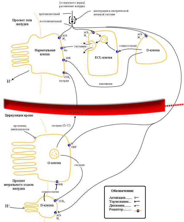 - Наиболее значительная фаза секреции — желудочная, начинается после попадания пищи в желудок. Растяжение желудка запускает выделение гастрина из G-клеток, расположенных в антральном отделе желудка. Гастрин, воздействуя на париетальные клетки напрямую или через активацию ECL-клеток с высвобождением гистамина, стимулирует продукцию соляной кислоты.
