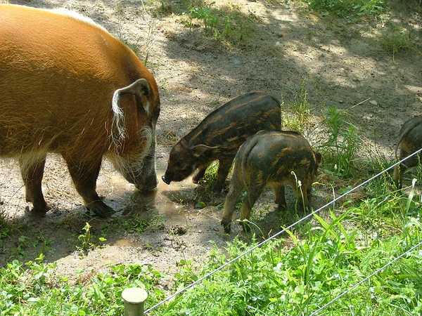 После 130-дневной беременности самка рожает от одного до шести (в среднем четыре) детёнышей. У них светлые полоски на шерсти и уже спустя непродолжительное время после рождения они в состоянии повсюду следовать за матерью. Самцы и самки одной группы вместе заботятся о потомстве, которое в возрасте от двух до четырёх месяцев отвыкает от молока, а в возрасте двух-трёх лет достигает половой зрелости.