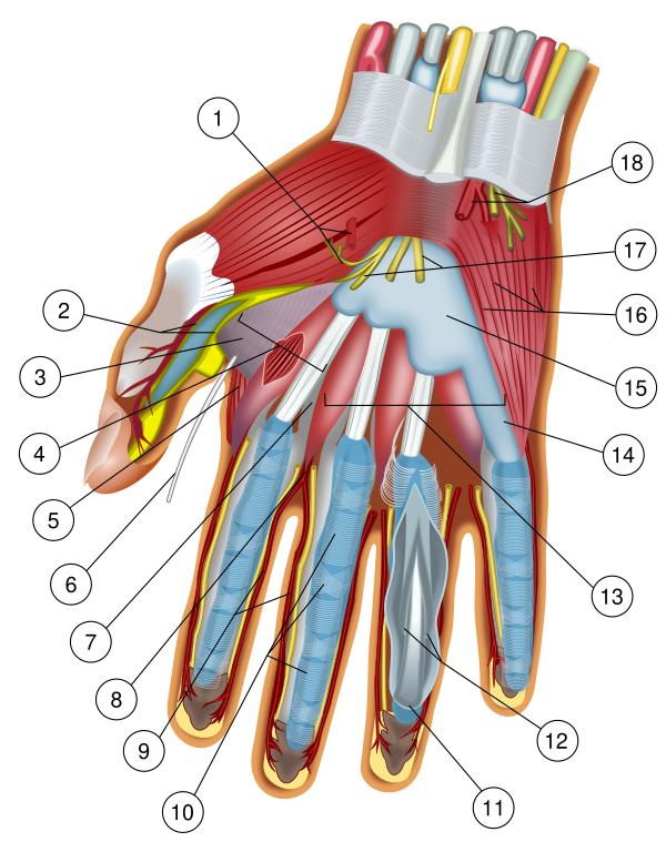 Ладонные синовиальные влагалища принадлежат проходящим в канале запястья сухожилиям сгибателей кисти и пальцев. Сухожилия поверхностного и глубокого сгибателей пальцев лежат в общем синовиальном влагалище, которое простирается до середины ладони, достигая дистальной фаланги лишь пятого пальца, а сухожилие длинного сгибателя большого пальца находится в обособленном синовиальном влагалище, которое переходит вместе с сухожилием на палец. В области ладони сухожилия мышц, идущих ко второму, третьему и четвёртому пальцам, на некотором расстоянии лишены синовиальных влагалищ и получают их вновь на пальцах. Лишь сухожилия, направляющиеся к пятому пальцу, имеют синовиальное влагалище, которое является продолжением общего синовиального влагалища для сухожилий сгибателей пальцев кисти.