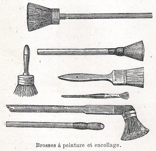 То же самое надо заметить про плоские кисти, в которых ширина верха равна основанию и кисть имеет вид лопаточки. Некоторые фабриканты приготовляют плоские щетинные кисти такой формы, что с одного края щетинки ниже, чем с другого, или же они располагаются зубчато. Это делается с целью облегчить в некоторых случаях технику живописи; однако форма этих кистей, после непродолжительного их употребления, изменяется, и кисть перестает удовлетворять своему назначению. Круглых и плоских кистей фабрикуется до 20 номеров тех и других; очень узкие приготовляются не из свиной щетины, а из козьего волоса. Очень широкие плоские кисти (до 5 дюймов ширины) употребляются для покрытия картин лаком.