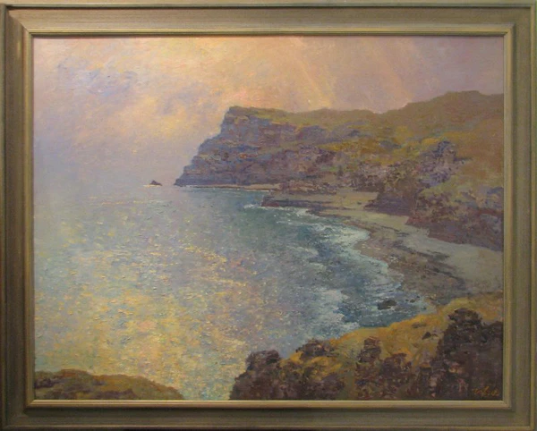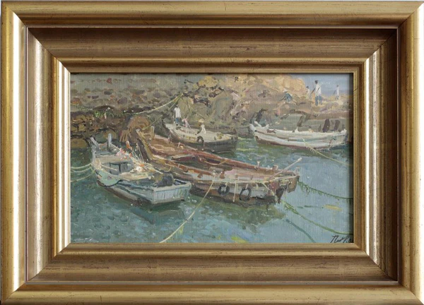 В центре композиции представлены четыре лодки, привязанные к берегу, что соответствует жанру марины. На берегу изображены фигуры людей в традиционных китайских шляпах, подчёркивающих национальный колорит сцены. Картина передаёт особенности прибрежной полосы Китайского моря, сочетая элементы пейзажа и этнографической зарисовки.