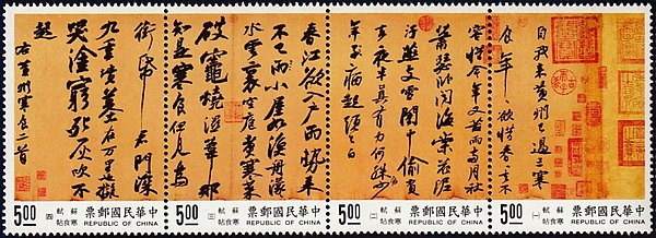 Почтой Тайваня 6 апреля 1995 г. выпущена сцепка (16 строк стихотворения Су Ши «Ритуал холодной пищи»). Цель выпуска — распространение в мире знаний о традиционной китайской культуре и, в частности, о каллиграфии[значимость факта?].