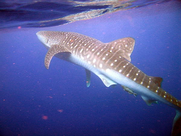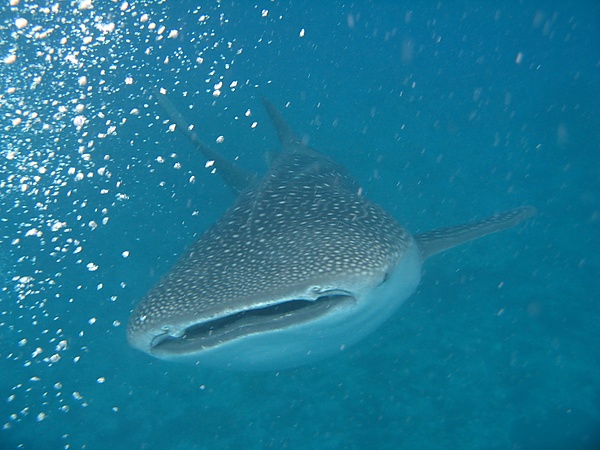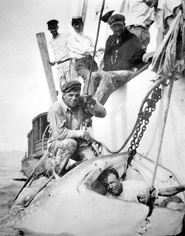 Мы взобрались на акулу и как следует её осмотрели, даже заглянули ей в пасть. Казалось, она нас вообще не замечает. Только когда мы стали трогать её рыло, она медленно пошла на глубину. Но скоро снова пошла наверх, и мы опять взобрались на неё.