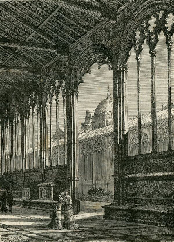 Эта постройка стала по счёту четвёртой на соборной площади и датируется столетием после принесения земли с Голгофы. Строительство массивного готического каре стен (в позднейшем значении: клуатра) в виде сильно вытянутого с запада на восток прямоугольника, наподобие базилики, или огромного нефа, под открытым небом, было начато в 1277 году архитектором Джованни ди Симоне, однако архитектор умер в 1284 году, когда Пиза потерпела поражение в морской битве при Мелории против генуэзцев[4] (Что, впрочем, опровергается другими источниками - так, последний документ об освобождении Джованни от налога в связи со строительством Опера-дель-Дуомо при Пизанском соборе, где ди Симоне занимал должность главного строителя, датируется 1286 годом [5]).