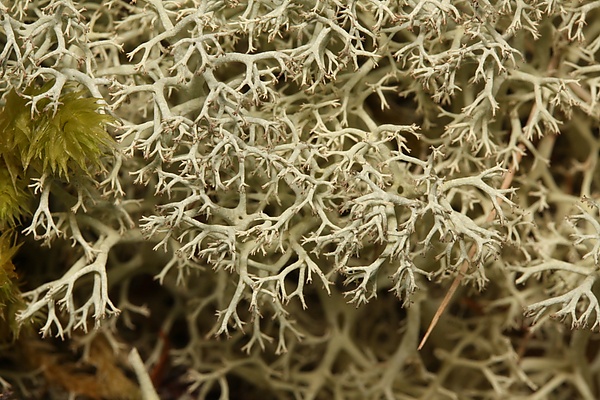 Cladonia portentosa f. portentosa. Подеции в верхней части сильно разветвлённые, жёлто-зеленоватые, образуют головковидные кустики. Встречается довольно редко, обитает в лесных массивах.