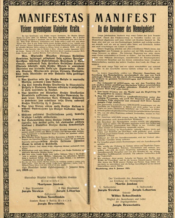 В 1917 году распалась Российская империя, а в 1918 году — Германская империя. 16 февраля 1918 года была провозглашена самостоятельным государством Литва. 28 июня 1919 года, после подписания Версальского договора, согласно 28 и 99 статьям договора в северной части Малой Литвы был образован Мемельланд (Клайпедский край), который был отделён победителями от Германии и поставлен под мандат Лиги Наций. Версальский договор также включил международное признание Литвы[11].