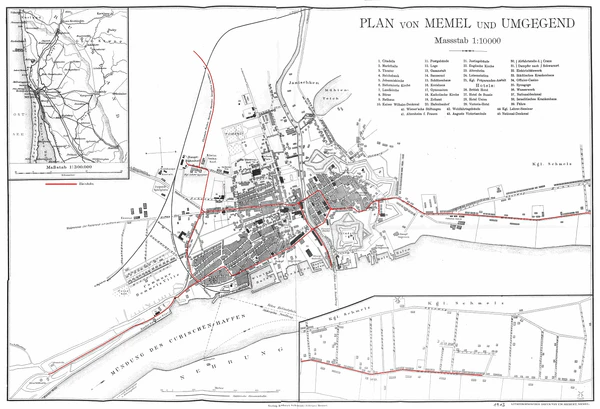 Северные пригороды Большая (Королевская) Вите уже в 1540 году населяло 20 семей, платящих налоги, а Малую Вите 23 семьи. Последний в XVII веке полностью слился с Большой Вите. Пригород постепенно рос. В 1825 году в Большой Вите стоял 321 жилой дом, а число жителей пригорода достигало 3610. В стратегическом смысле Большая Вите уже в XIX веке воспринималась как часть города, так как в 1812 году, планируя и строя шанцы, пригород был включён в территорию укреплений. Диалог о включении пригорода в городскую черту вёлся на протяжении всей первой половины XIX века, но лишь в 1856 году Большая Вите была инкорпорирована в черту города, так увеличивая население города сразу на треть. Если по переписи 1855 года в черте города проживало 11 976 человек, а в пригороде Большая Вите — 5114, то после присоединения пригорода к городу население Мемеля в 1856 году подскочило до 17 198 человек[22]