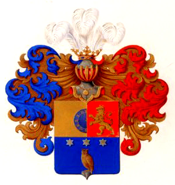 Щит увенчан дворянскими шлемом и короной. Нашлемник: три серебряных страусовых пера. Намёт: справа лазоревый с золотом, слева червлёный с золотом (Герб. XI, 131).
