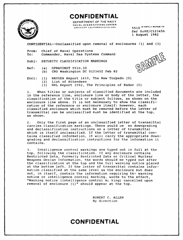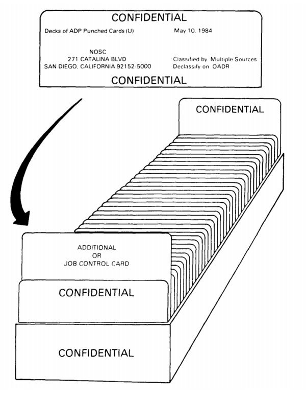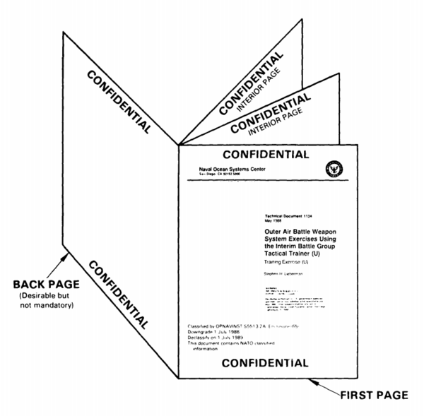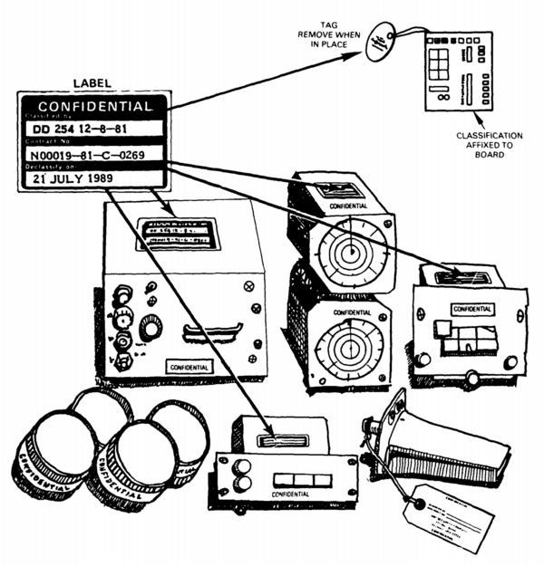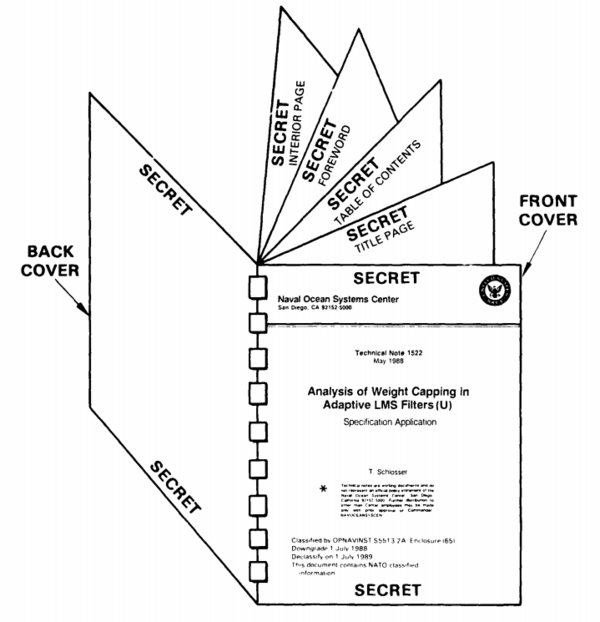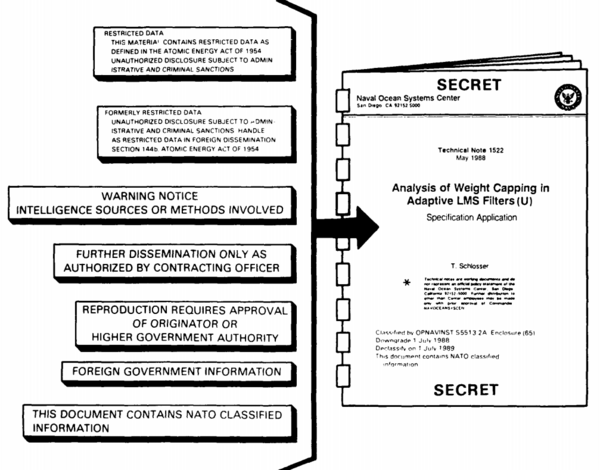 Подавляющее большинство секретных документов правительства создаются как «производные засекреченные». Например, если одна страница информации, взятой из секретного документа, помещается в документ вместе с 100 страницами несекретной информации, такой документ в целом будет секретным. Правила засекречивания (часто игнорируемые) предусматривают, что каждый параграф документа должен иметь маркировку: U (Unclassified) — открытая информация, C (Confidential) — «секретно», S (Secret) — «совершенно секретно», и TS (Top Secret) — «совершенно секретно, особой важности». Таким образом, в приведённом примере, только один параграф должен иметь маркировку S. Если этот параграф находится с двух сторон листа, то страница должна быть отмечена SECRET сверху и снизу[19].