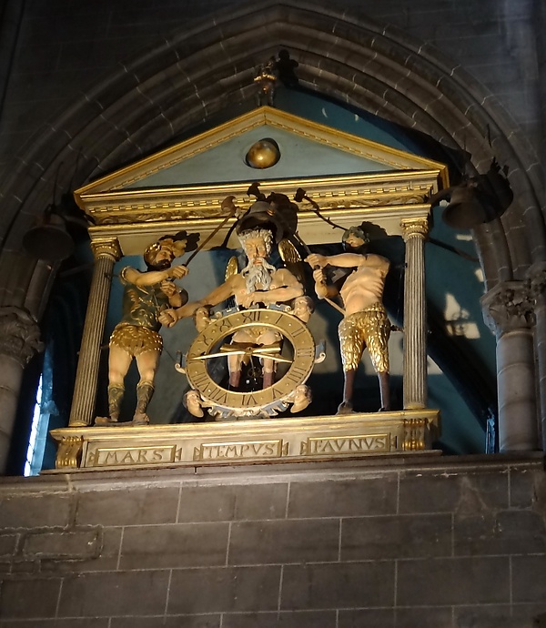 Спустившись вниз, можно попасть в сокровищницу собора, где представлены роскошные литургические предметы и скульптурные группы, среди которых выделяется великолепная серия овернских мадонн с ребёнком. В северном крыле трансепта размещены очень хорошо сохранившиеся башенные часы с человечками (жакмар). Изначально они находились в Иссуаре, и были куплены городом Клермоном для установки в церкви Святого Жене, а после её закрытия были переданы сюда, в кафедральный собор. Красивые часы датированы 1527 годом. Три крупные статуи служат прообразом Времени, благородный старец с почтенной бородой окружён двумя автоматами, которые по очереди пробивают время.