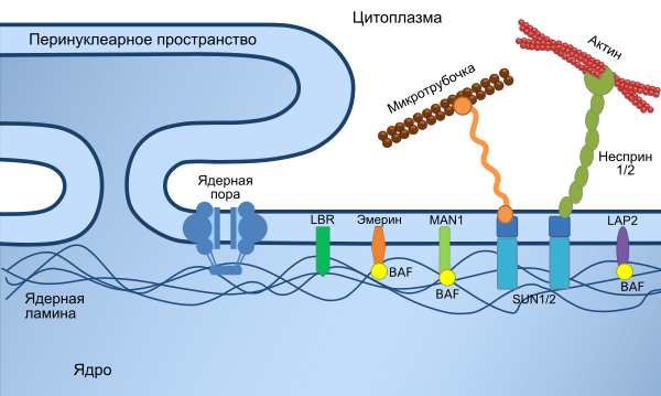 Ядерная оболочка состоит из двух мембран (наружной и внутренней), которые расположены параллельно на расстоянии от 10 до 50 нм. Ядерная оболочка полностью окружает ядро, отделяя генетический материал клетки от цитоплазмы и служа барьером, предотвращающим свободную диффузию макромолекул между нуклеоплазмой и цитоплазмой. Наружная ядерная мембрана продолжается в мембрану шероховатого эндоплазматического ретикулума (ЭПР) и покрыта рибосомами. Промежуток между ядерными мембранами называется перинуклеарным пространством и продолжается в люмен ЭПР[9].