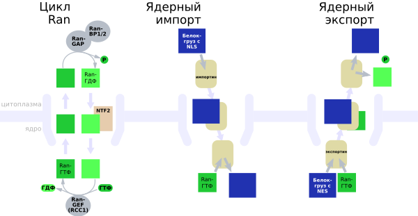 Выход из ядра и вход в ядро крупных молекул контролируется ядерными порами. Хотя малые молекулы могут проникать в ядро без всякой регуляции, макромолекулы — такие, как белки и РНК — должны связаться с кариоферинами для транспорта в ядро (импортинами) и из ядра (экспортинами). Белки, которые должны быть транспортированы из цитоплазмы в ядро, содержат особую аминокислотную последовательность, известную как сигнал ядерной локализации, с которой связываются импортины. Аналогичным образом белки, которые должны выйти из ядра, содержат сигнал ядерного экспорта, распознаваемый экспортинами. Способность импортинов и экспортинов переносить свой груз регулируется ГТФазами — ферментами, которые гидролизуют ГТФ с высвобождением энергии[13]. Ключевая ГТФаза ядерного транспорта — Ran, которая может связываться с ГТФ или ГДФ, в зависимости от своего местонахождения (в ядре или в цитоплазме). В ядре взаимодействие Ran-ГТФ с импортином вызывает конформационные изменения в последнем, так что он отделяется от переносимого груза. Образованный комплекс Ran-ГТФ и импортина транспортируется в цитоплазму, где белок RanBP отделяет Ran-ГТФ от импортина. Отделение от импортина позволяет белку GAP (белок) связаться с Ran-ГТФ и катализировать гидролиз ГТФ до ГДФ. Далее комплекс Ran-GDP распознаётся белком NUTF2, который возвращает его в нуклеоплазму. В ядре белок GEF (белок) заменяет ГДФ на ГТФ, образуя Ran-ГТФ и замыкая цикл[52].