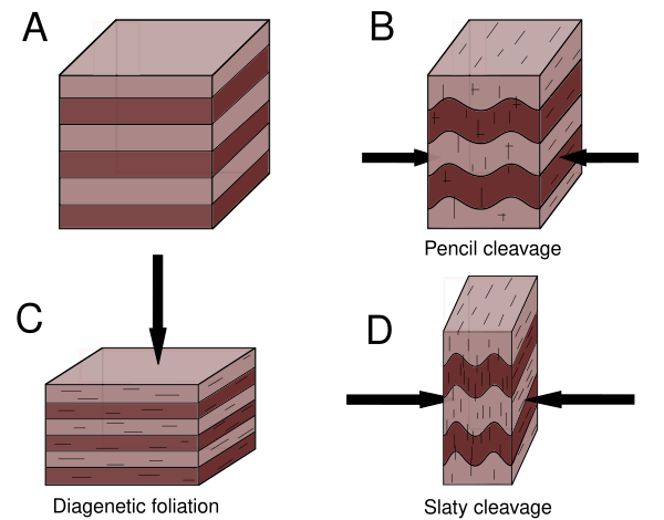 Кливаж особенно хорошо заметен в так называемых кровельных сланцах — глинистых сланцах с толщиной пластин до доли миллиметра; в известняках и песчаниках, имеющих более толстые и грубые пластины, проявляется не так заметно. Кливаж происходит под воздействием воды, выделяемой минералами при метаморфизме горных пород, и перекристаллизации минералов в условиях сжатия, перпендикулярного по отношению к их осевым плоскостям, под влиянием чего в земной коре образуются линейные складки. Сжатие кристаллов минералов происходит в плоскости, которая перпендикулярна оси сжатия, что приводит к образованию внутренней ориентированной плоскопараллельной структуры породы, а их плоская ориентировка принимает направление, также перпендикулярное осевым плоскостям, вследствие чего порода приобретает свойство раскладываться на пластины в том же направлении. Если имеет место сильная перекристаллизация, когда размер плоских ориентированных кристаллов превышает 1 миллиметр, то это приводит к появлению у породы свойства сланцеватости.