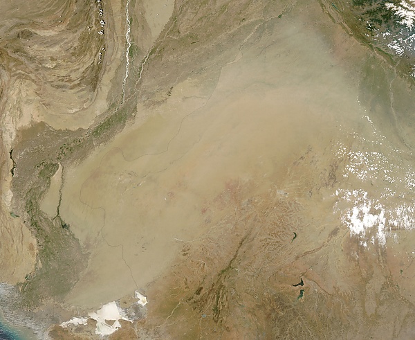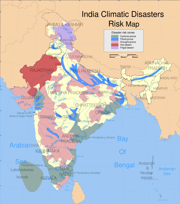 Основные стихийные бедствия Индии, связанные с климатом, включают в себя наводнения, засухи, тропические циклоны, лавины, вызванные проливными дождями оползни, метели. Большой материальный ущерб в Северной Индии наносят также пыльные бури, которые часто случаются летом и приносят огромное количество пыли из засушливых пустынных районов[24]. В некоторых районах страны серьёзной опасностью является град, который иногда портит такие сельскохозяйственные культуры, как пшеница и рис.