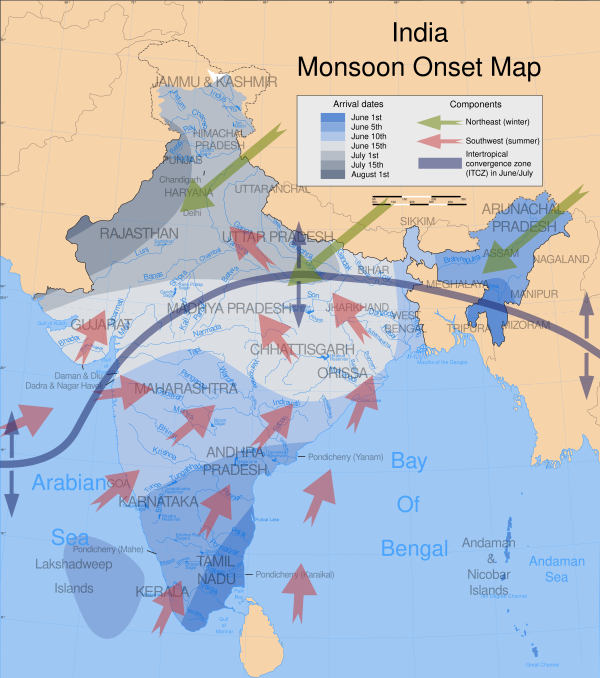 Во время юго-западного муссона в большинстве регионов страны выпадает вплоть до 80 % их годовой нормы осадков[9]. Юго-западный муссон приходит на территорию Индии в виде двух основных ветвей — ветви Бенгальского залива и ветви Аравийского моря. Последняя из них распространяется, продвигаясь к области низкого давления над пустыней Тар, примерно в 3 раза сильнее, чем ветвь Бенгальского залива. Муссон обычно впервые достигает территории Индии около 25 мая, когда он приходит на Андаманские и Никобарские острова в Бенгальском заливе. Около 1 июня он обрушивается на территорию Малабарского берега в Керале, около 9 июня — достигает Мумбаи, а около 29 июня — Дели[10]. Ветвь Бенгальского залива, достигая Коромандельского берега недалеко от мыса Коморин, движется сперва на северо-восток вдоль побережья вплоть до территории Ориссы, а затем сворачивает на северо-запад, к Индо-Гангской равнине. Ветвь Аравийского моря продвигается на северо-восток вплоть до Гималаев.