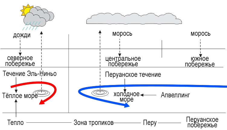 Относительно большое количество осадков на севере связано с проникновением сюда в зимние месяцы экваториальных воздушных масс, воздействие которых усиливается поверхностным тёплым течением Эль-Ниньо. Оно возникает в заливе Гуаякиль, обычно незадолго до Рождества, и движется с небольшой скоростью к югу, исчезая на широте города Пайта (около 5° ю. ш.). Эль-Ниньо уничтожает температурную инверсию, вызывает подъём тёплых влажных воздушных масс до уровня конденсации влаги и, как следствие, короткие ливни[13].