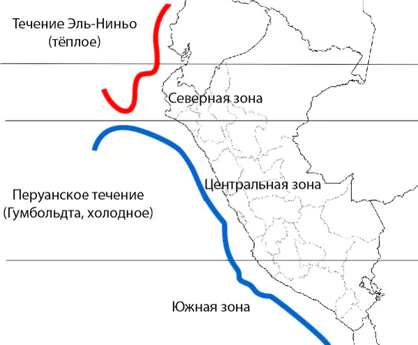 У центрального и южного побережья холодное течение Гумбольдта в результате процесса апвеллинга охлаждает прибрежные воды, и влияет на засушливый климат центрального и южного побережья.