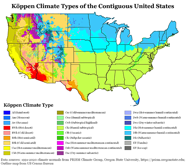 В приведённой ниже таблице представлен список климатических данных по населённым пунктам США.[7]
