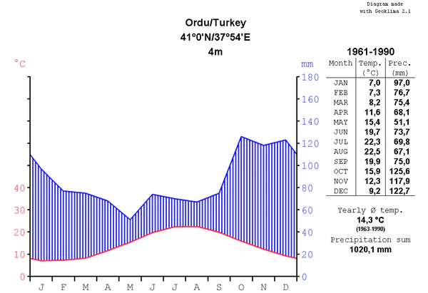 - Черноморский климат распространён на Черноморское побережье и север Мармары. Климат дождливый, не засушливый; летом прохладный, зимой на побережье тёплый, а в горах холодный.
