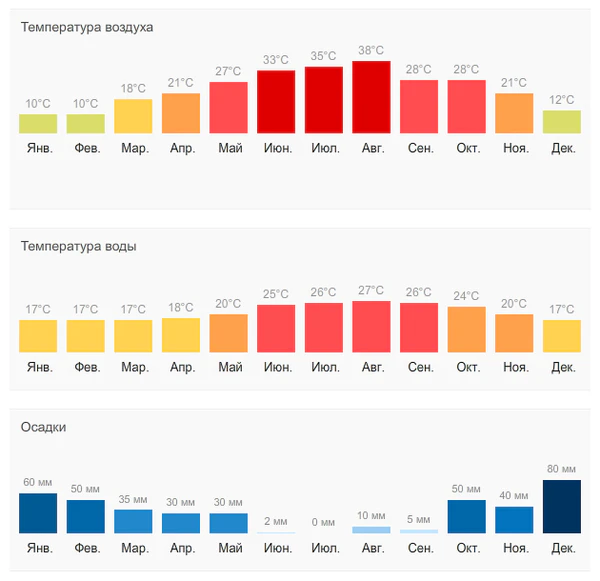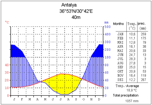 На Чёрном море климат умеренно-морской с характерными для него тёплым летом и прохладной зимой. Средняя температура зимой (в январе) составляет примерно +5 °C, летом (в июле) — около +23 °C. Осадков выпадает до 1000—2500 мм в год. Летом среднесуточная температура может превысить +30 °C и (изредка) +35 °C, а жара может превысить +40 °C, но это бывает сравнительно редко на южном побережье Турции.