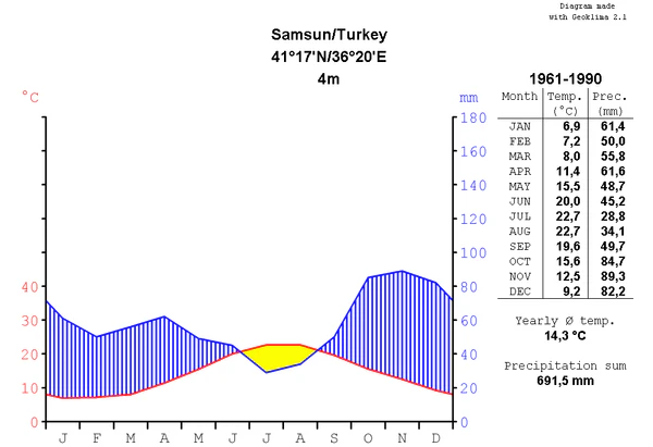 На юго-востоке Турции климат имеет черты тропического пустынного, и влажность низкая, в отличие от высокой влажности на берегу Чёрного моря.